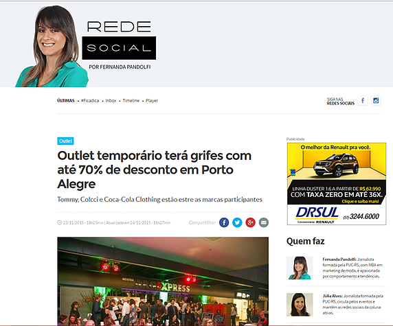 Apogeu – Adriana Outlet – Armazém das Fábricas – Beagle – Bia Brazil – BruParis – C&C Couro e Cia – Colcci – Garage – Rider Denim – Malhas Dallmar – Daia Graciano – Daniela Pereda – Datelli – Descolada Modas – Deyfer Calçados – LaCore Calçados – Summer Glasses – Distinto Modas – Feira das Bolsas – JP Bolsas – NinaRô Calçados – Espaço Premium – Dirrarra Semi-Jóias – Distinto – Elite – Eagle Calçados – Empório Vermount – Espaço Glam – FTStore – Essência Shop – FastBiju – Fetish Lingerie – Fit Clothing Line – Gillerie – Gloss – Guria do Sul – Homem Company – Iáiá – Ana Rosa – Inaiê – Index Krown – King Calçados – Klafer – La Mafia Brasil – Linka Bikinis – Cherry Blossom – Lolla´s – Lulla Trulla Babykids – Maria Quiteria – Conexão Zero11 – Espumantes Castellamare – Kafofo das Têre – Mistike Bolsas – Studio Moda – Bethina Toigo Acessórios – Nutri Point – Polo HPC – Tag Point – Mareblu – Marra SportWear – Mc Bennet – Meu Bebe É Show – Merckado Da Mulher – Merci Decor Brasil – Live! – Miose Bolsas/Pop Me – Mistike Bolsas – My Soul – Nobre Causa – Open The Box – Outlet Glam Floripa – Pedrita – Pitanga By Brasil – Planeta Surf – Recuo – Riukiu – Running Brasil – Sapataria Web – Sentindo Aroma – Triton – Coca Cola – Levis – Ton Âge – Top Concept – TNG – Up! Shoes RS – Verse – VR Acessórios – X10